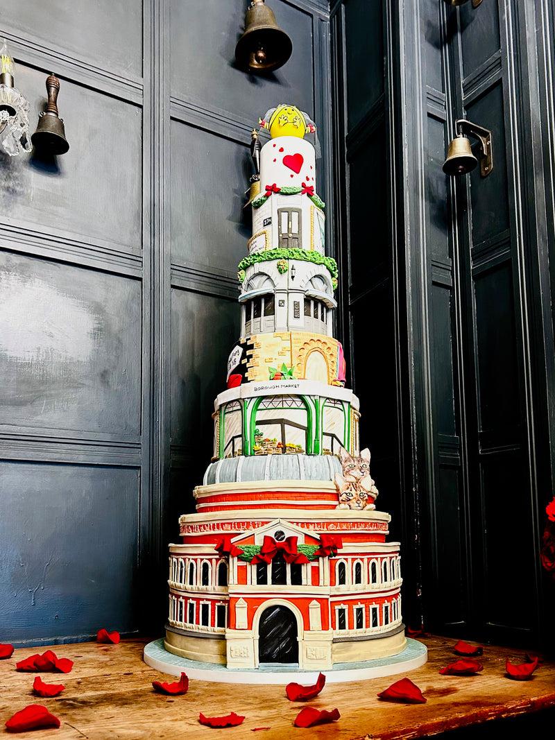 See below our recent ‘story cake’. This was delivered recently to The Chelsea Pig for W & C’s wedding, following their vowels at Kensington and Chelsea Registry Office. The couple first met at the Royal Albert Hall.. their fist date at Borough Market… holidays in Marrakech.. moving in to their Chelsea home (57a).. topping off *literally’ with Little Miss Sunshine, which is W’s pet name for C! This is such a fabulous example of how diverse our cake making skills are! We absolutely adored designing and creating this cake. SO much fun and really allowed us to go to town with our creativity!