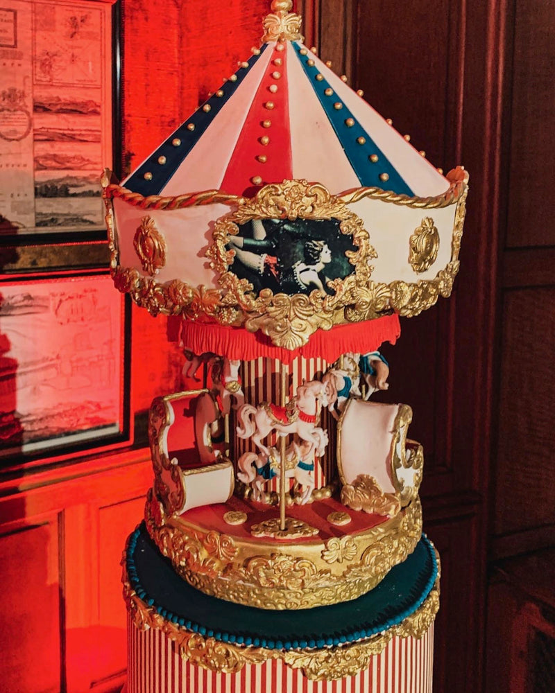 With any commission our first go to for inspiration is the stationery. The stationary had already been designed so we had an amazing starting point. If you look at the images here you will see the ‘Sepia Circus’ images that we worked from. You will also see how we recreated the ‘Come all, Come all’ Invitation, on the cake, handcrafted from icing. Esme wanted a carousel, she wanted the inspiration from the invitations used and she wanted it big, but not so big as to over shadow the wedding cake on the Saturday.