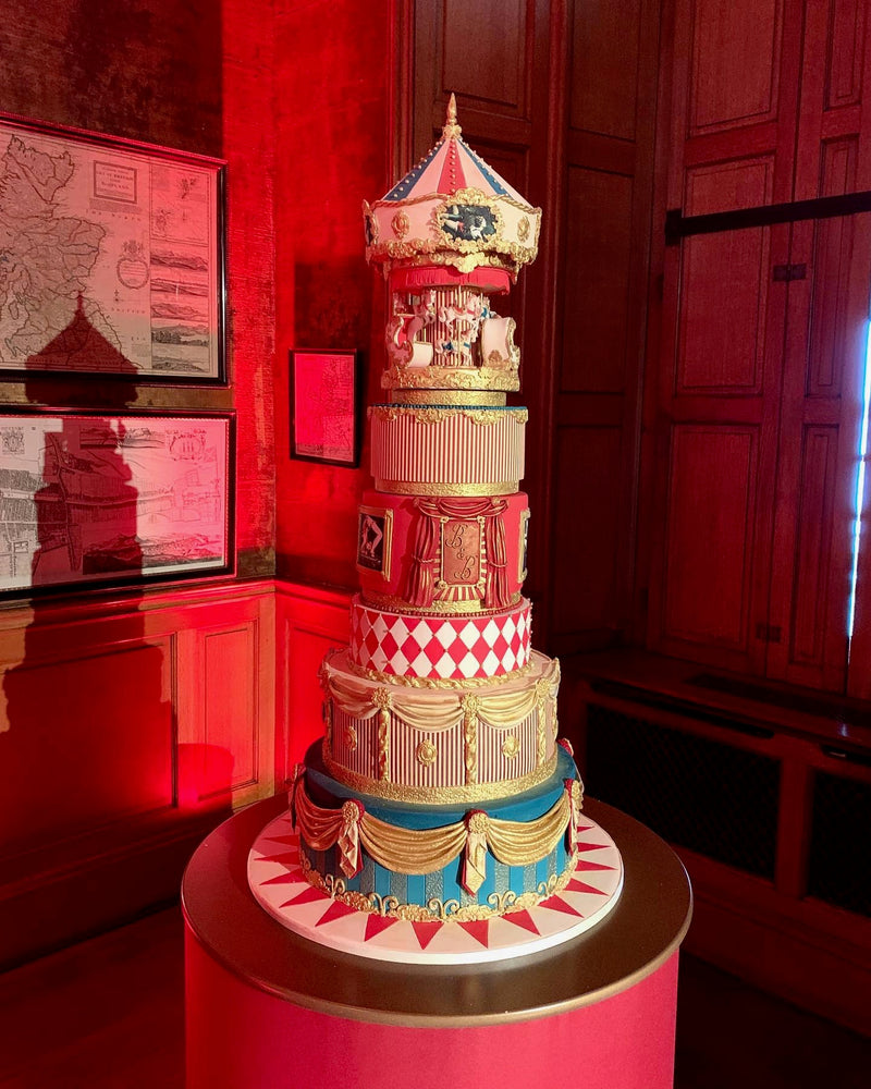 This commission was our biggest to date. A four day wedding in Scotland and we were commissioned to design two cakes. An eight tier wedding cake extravaganza for the wedding on the Saturday at one castle plus a 5 tier circus themed cake for the pre-wedding party at a different castle for the Friday. It was a lot. It was hard work, it was incredibly stressful and we loved every single minute of it!