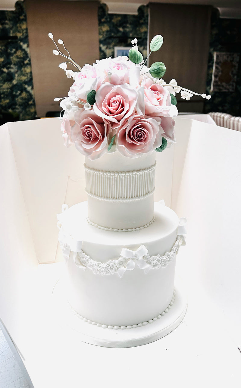We have produced quite a few vintage style cakes this year. Not just for weddings, but for birthday parties too. When we make a piped cake, we use the traditional skill of royal icing (rather than buttercream) Royal icing has a much more professional finish and also won’t melt on a warm day!