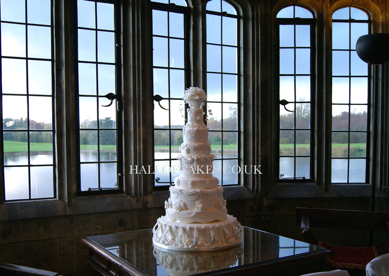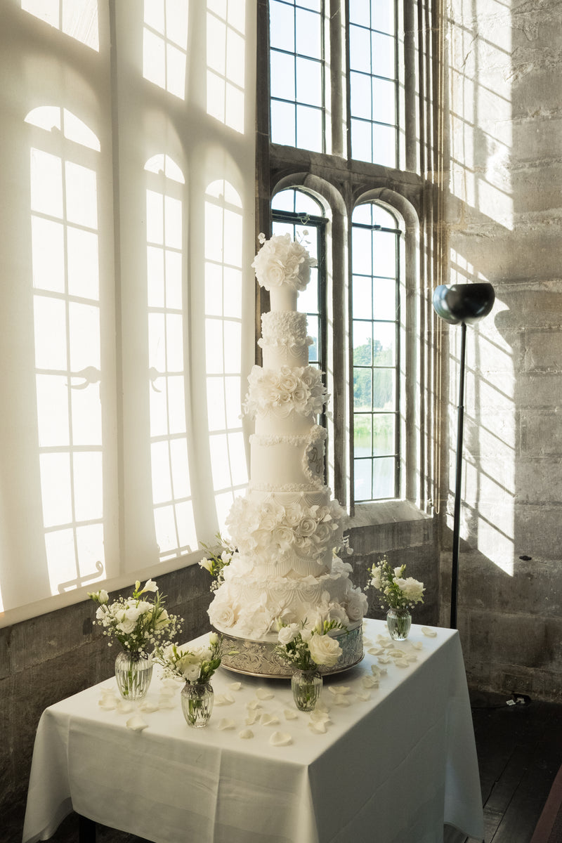We are often asked which is our favourite venue in Kent.. Thats a tricky one to be honest as peoples’ wish lists do differ greatly. Without a doubt, Leeds Castle is the most historic venue and setting up one of our wedding cakes in the incredible King Henry VIII Banqueting Hall never gets tiring. Although driving over the tiny bridge to the main castle island with a six tier on board never gets any less stressful! Plus, we do often have to unload with a lot of tourists watching on and taking photographs! We have set up some magnificent wedding cakes at Leeds Castle – a few of them are shown here below. The huge window in the Banqueting Hall is the most incredible backdrop for one of our wedding cakes and I am not sure we have found another window in the UK that rivals it! Not that we tour the UK looking for windows but…!