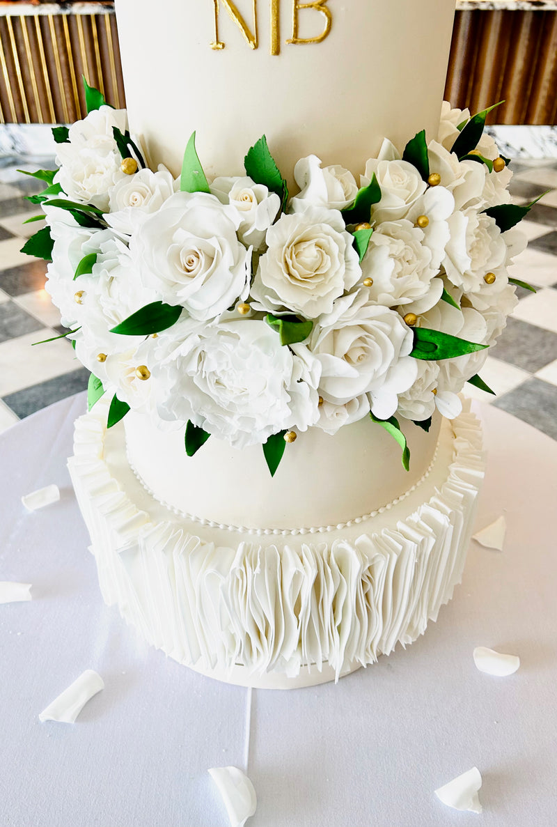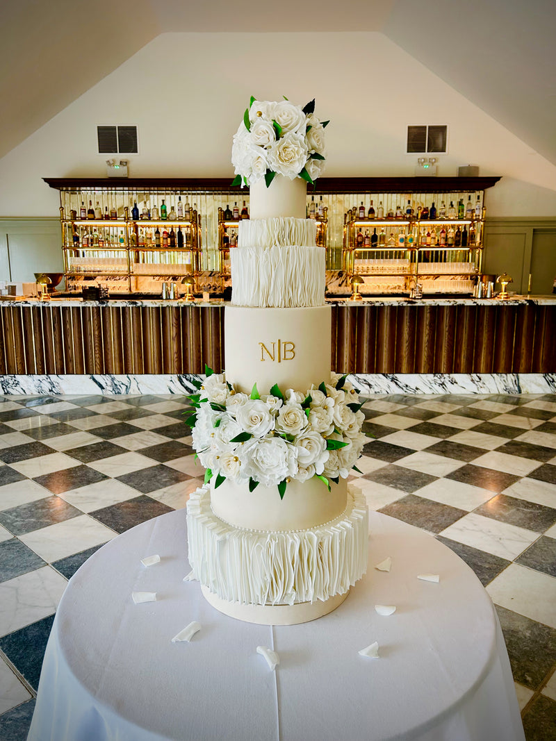 Firstly, the cake design.. Nikki loved the vertical ruffles (ok, Brandon did too but let’s be honest it was mainly about Nikki :) She also loved the white sugar flower cascade coming down the front. One of my first questions to a couple when design their wedding cake is ‘where will your cake be positioned’. If the cake is going to the side of the room and only has a front view, then a frontal cascade is perfect. But, if the cake is going to be seen 360, then they design needs to be 360. No front and no back. Nikki and Brandon confirmed that the cake would be to the side of the room in the main bar area at Kin House.