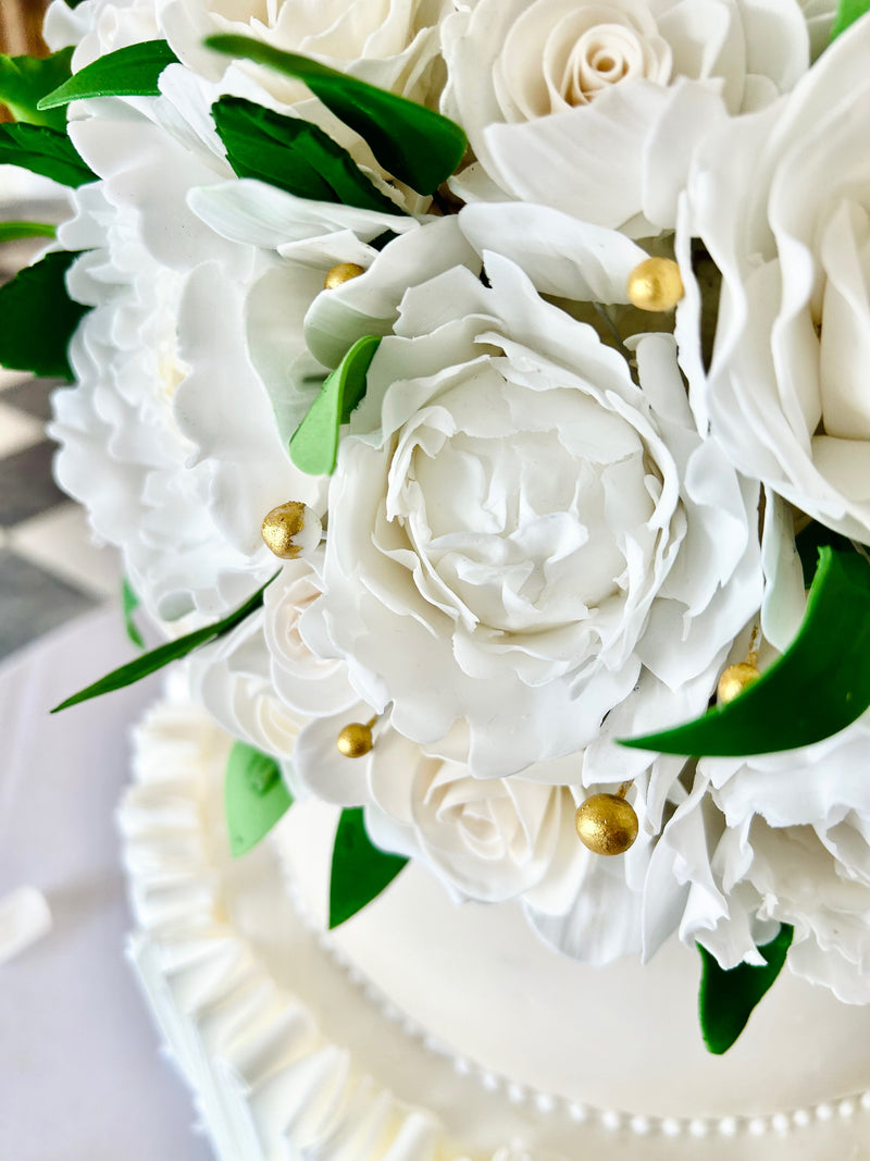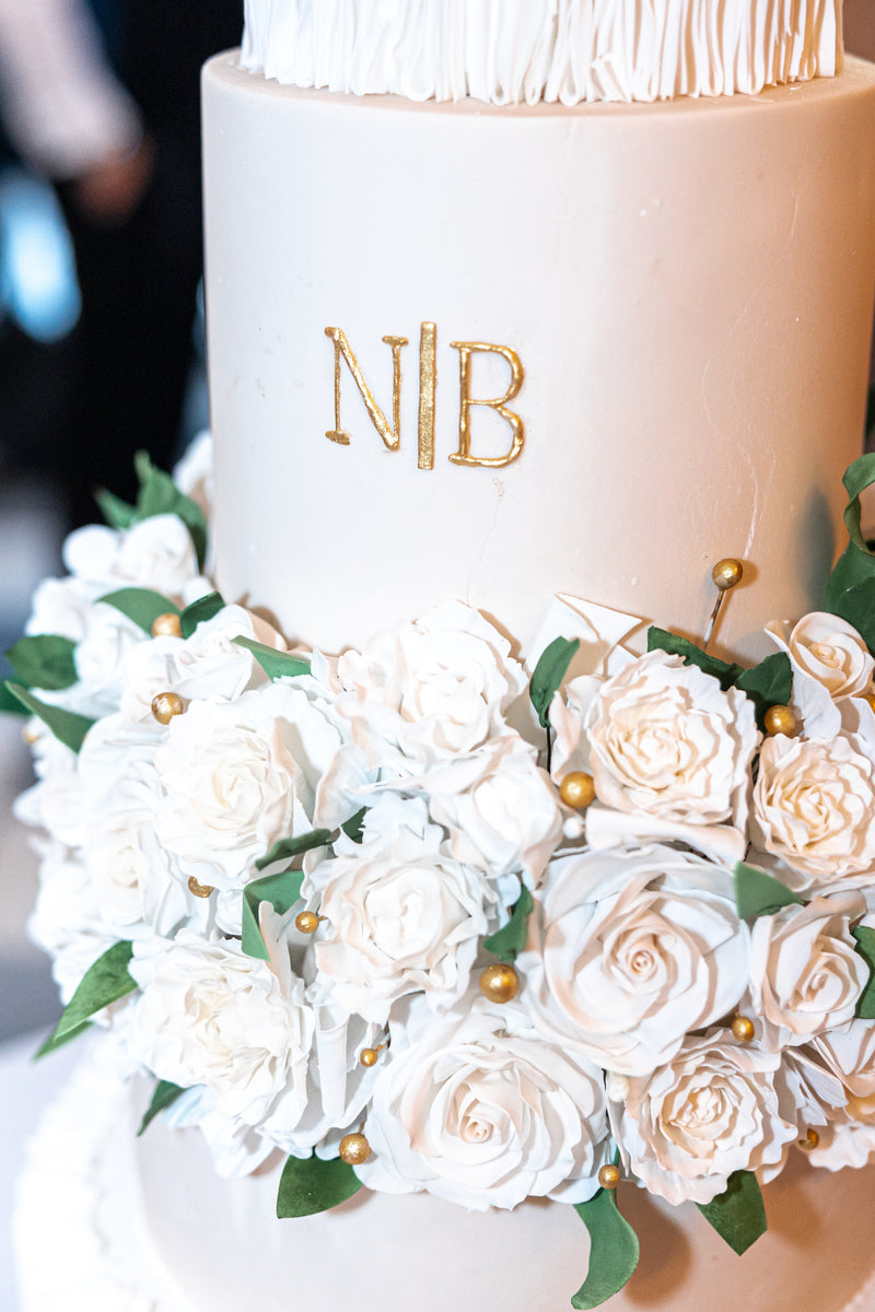 N & B wanted their wedding cake at Kin House to be mainly white, contrasting with champagne and some minimal gold detail. Nikki showed me their stationery and, how ‘N & B’ was shown on the invitation. This is what we wanted to replicate and to do this detail in gold would be perfect. Peonies and roses were the chosen fresh florals but the favourite of these was peonies. Nikki absolutely adores peonies and asked if we could create as many peonies as possible (within their budget).