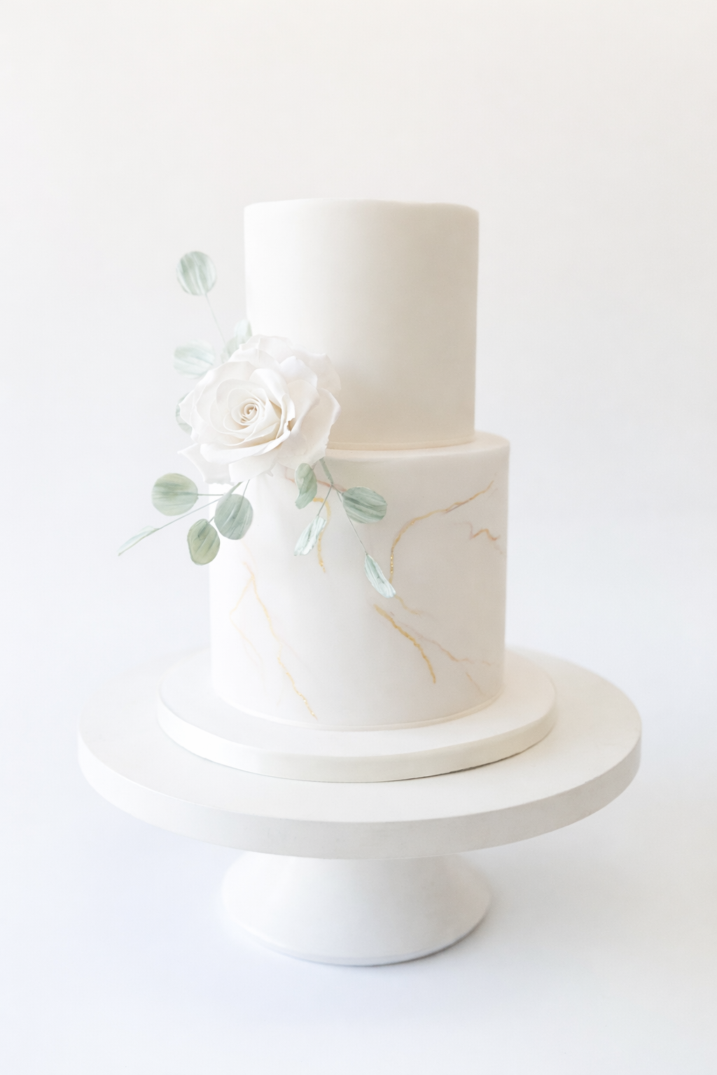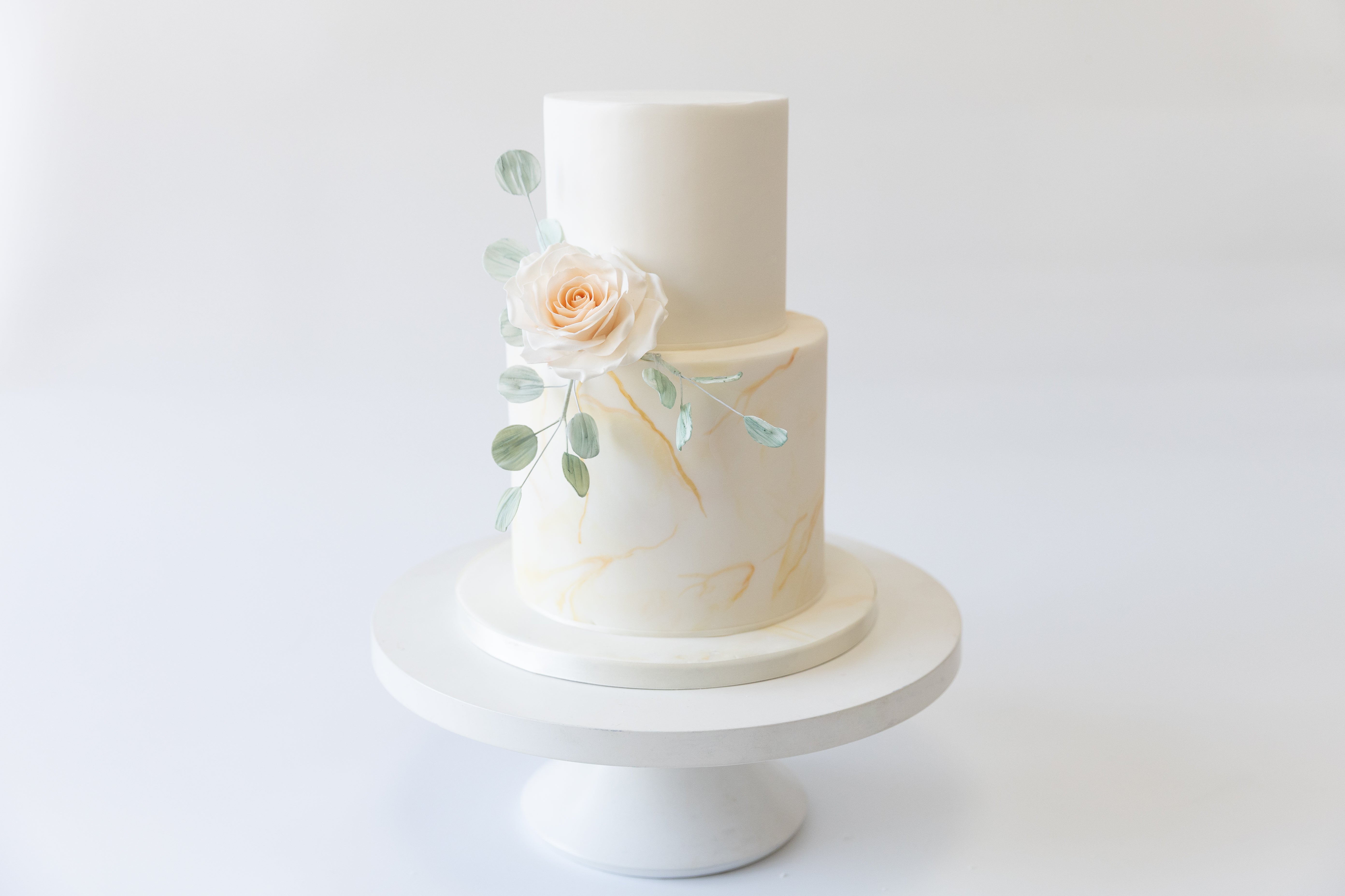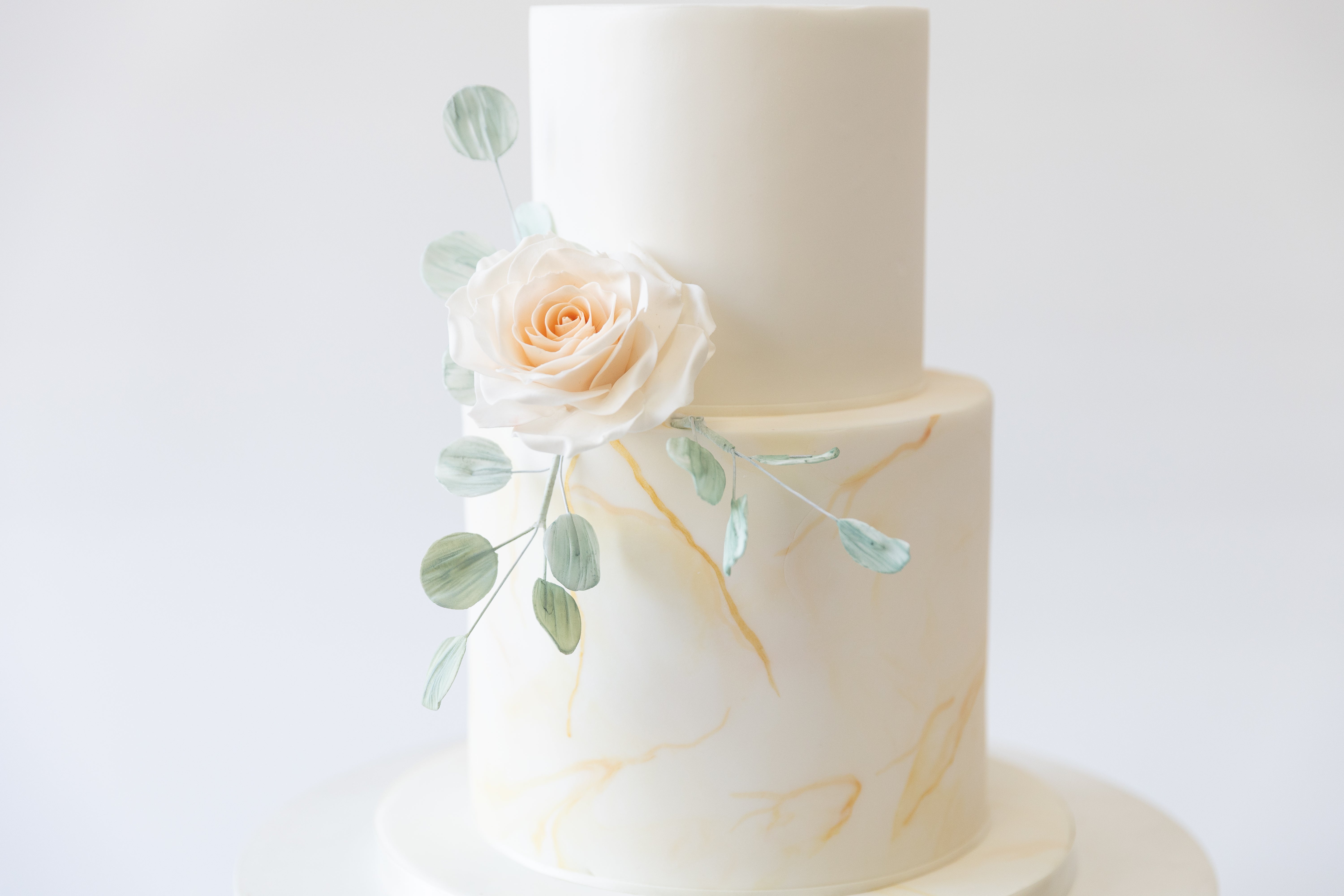 A smooth, ivory fondant finish is detailed with delicate hand-painted marble veining and subtle strokes of gold leaf, creating a soft, luxurious texture. The design is finished with a single handcrafted sugar rose and gentle eucalyptus detailing, bringing a modern botanical feel to this classic silhouette.
