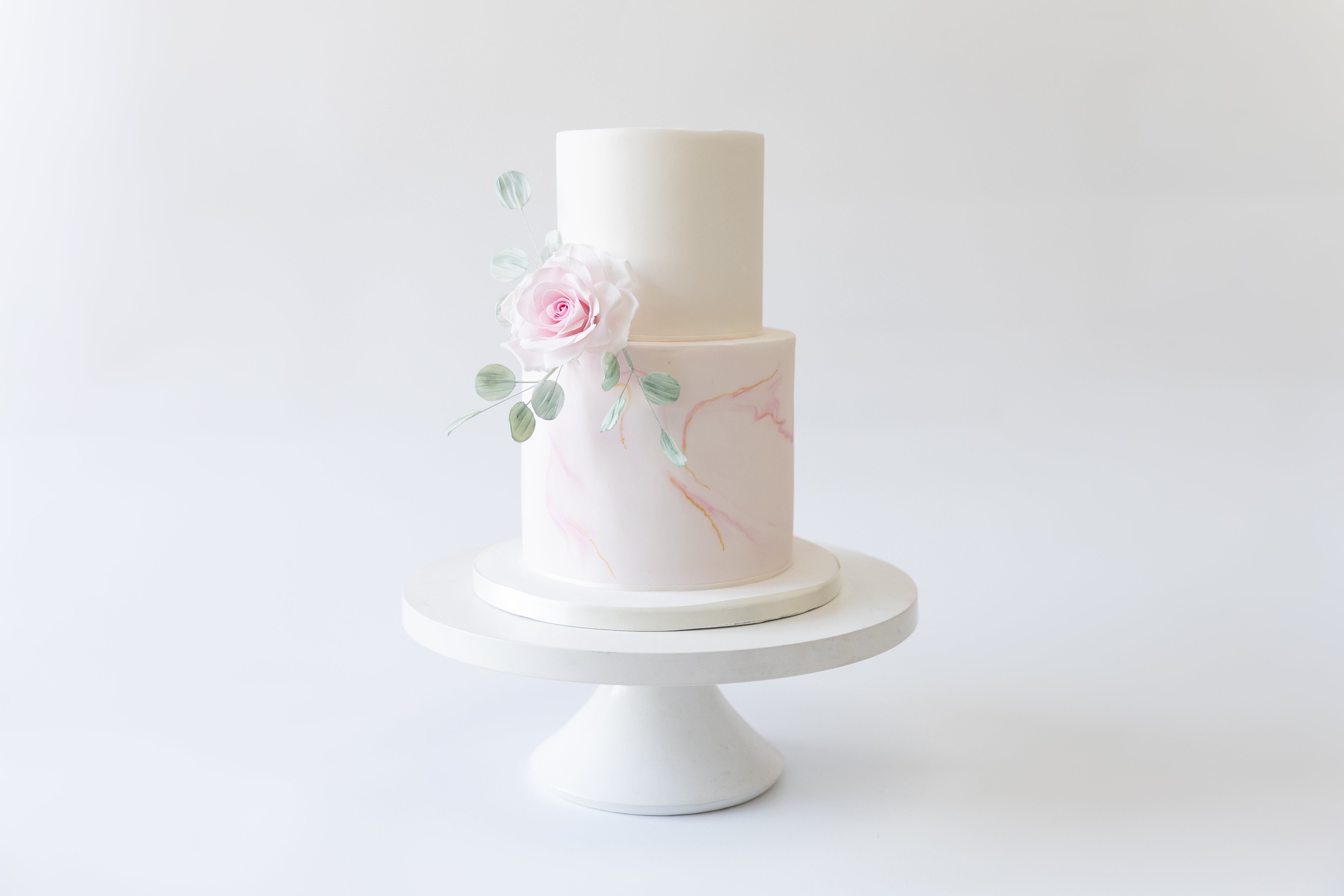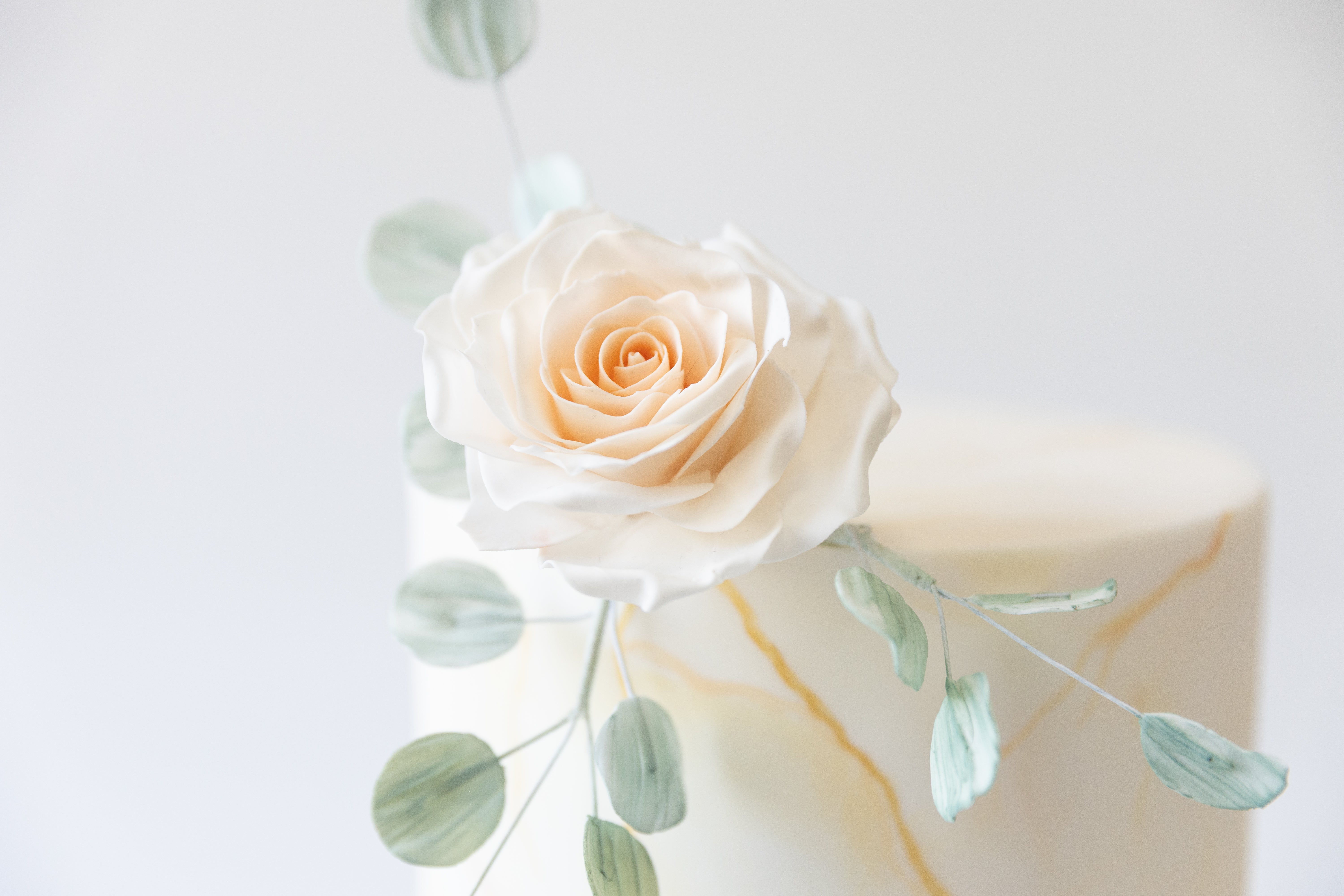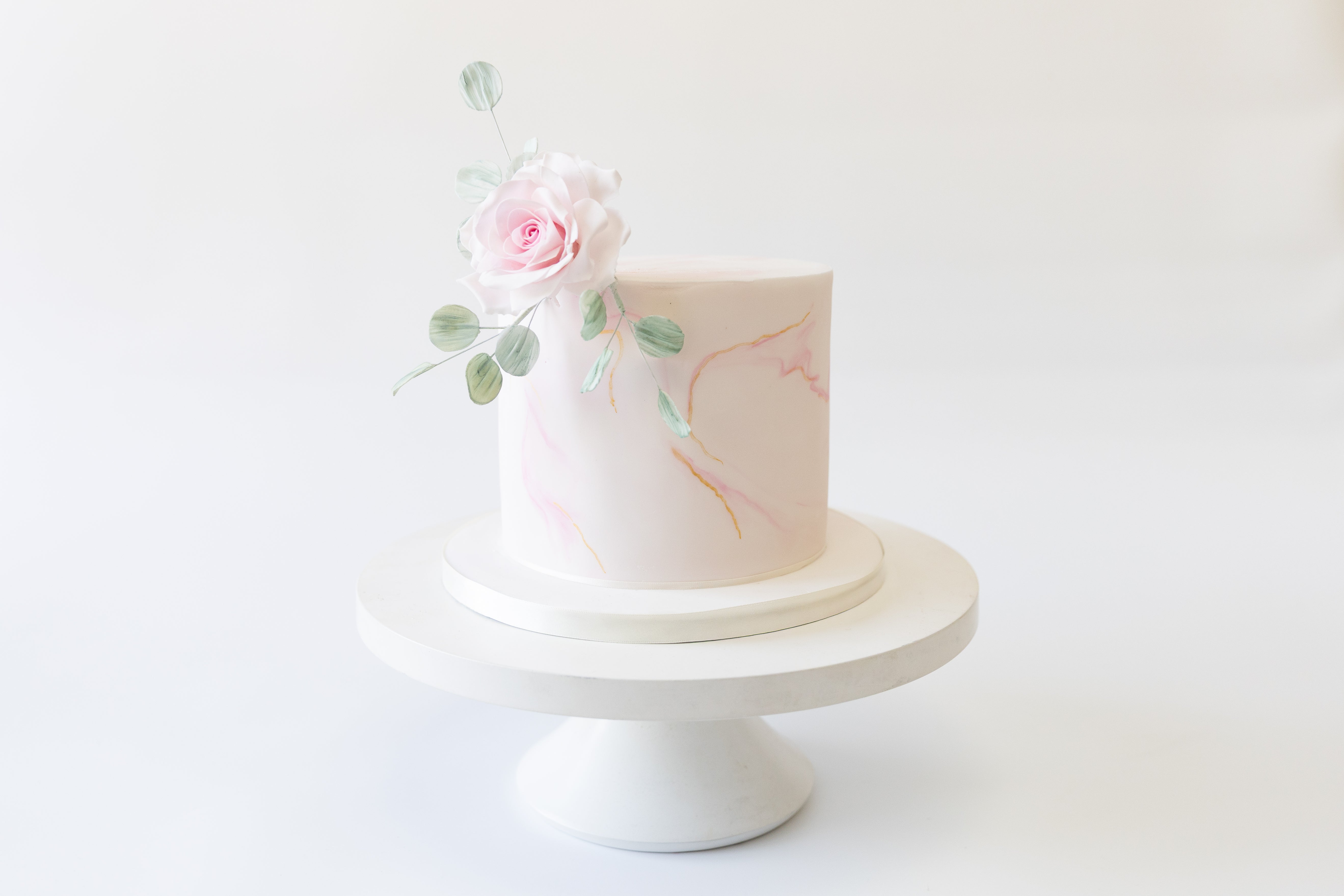 A smooth, ivory fondant finish is detailed with delicate hand-painted marble veining and subtle strokes of gold leaf, creating a soft, luxurious texture. The design is finished with a single handcrafted sugar rose and gentle eucalyptus detailing, bringing a modern botanical feel to this classic silhouette.