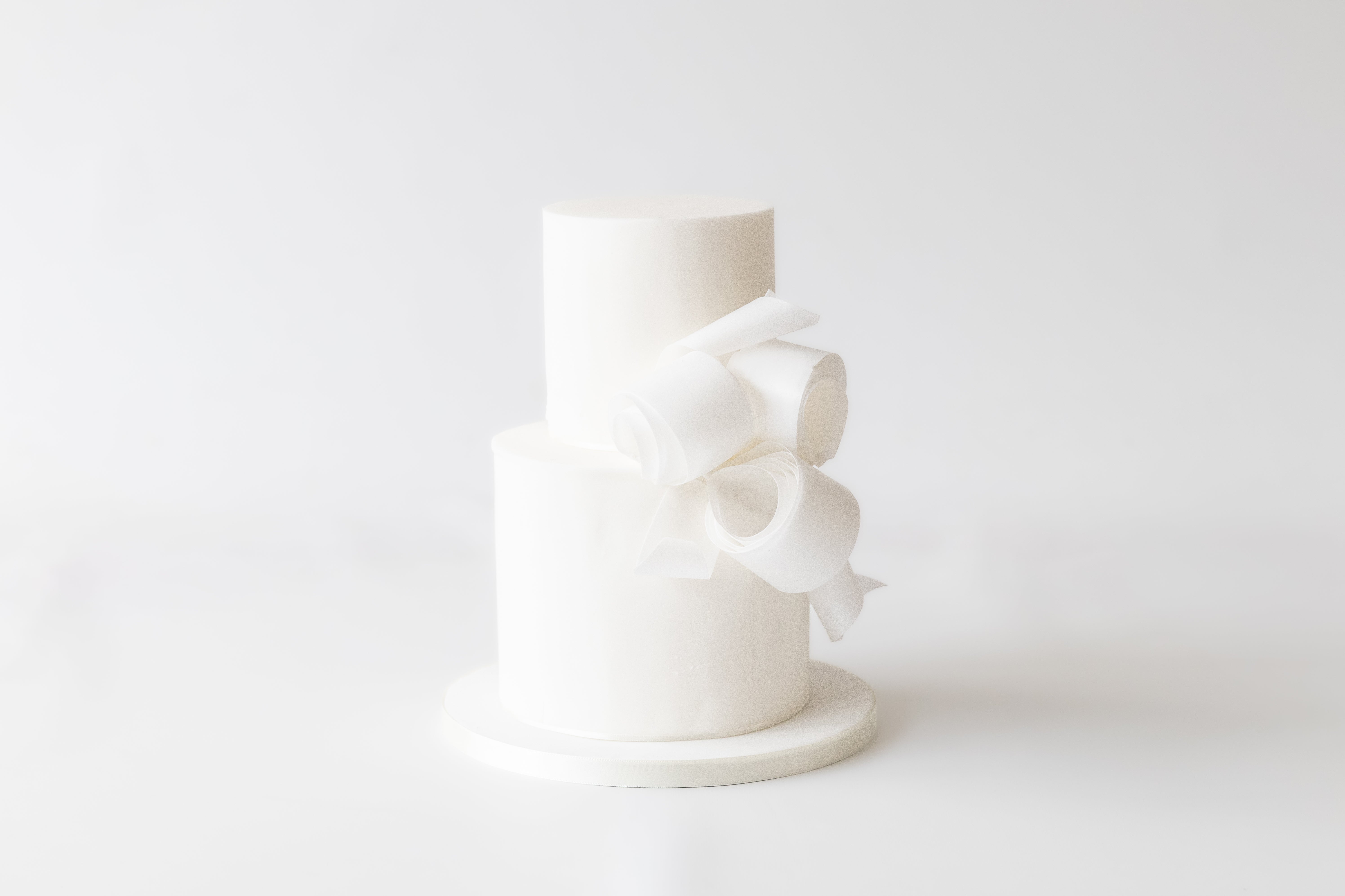 Delicate wafer paper flourishes on this otherwise simple but chic beauty. Perfect for the wedding couple looking for a modern yet dreamy compliment.