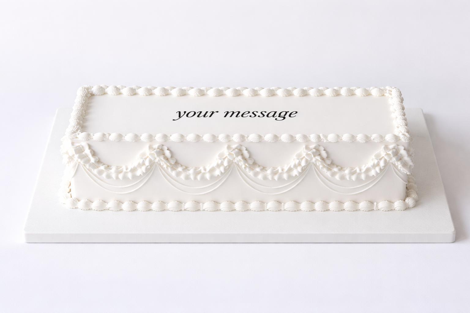 The Rectangle Wedding Cake is a striking centrepiece designed for modern celebrations and larger gatherings. Its elegant rectangular shape offers a contemporary alternative to traditional round cakes while providing generous portions for your guests.